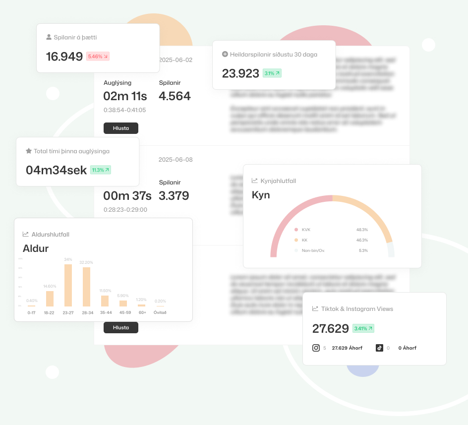 Fyrirtæki fá mánaðarlega skýrslu yfir auglýsingabirtingar, frammistöðu hlaðvarpsins og hagnýta samantekt sem auðveldar mat og eftirfylgni. Ásamt því fá fyrirtækin hljóðbrot, textaðar auglýsingar & sjálfvirka eftirfylgni á hlaðvörpin fyrir hönd fyrirtækisins.